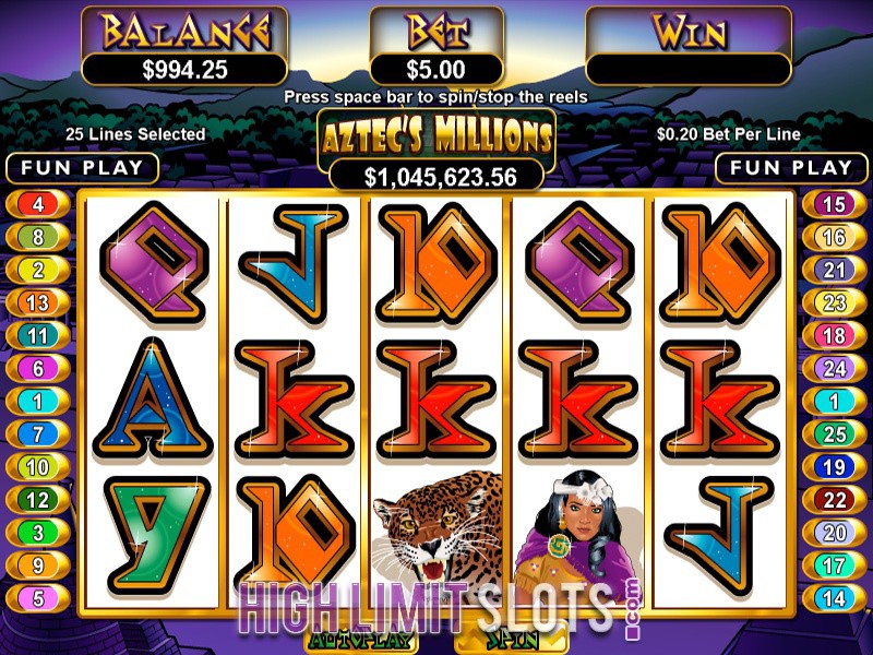 - Aztec's Millions. The jackpot of this 5 reel, 25 pay-line video slot goes over 1 million dollars and the game features wild and scatter symbol, multiplier and free spins.