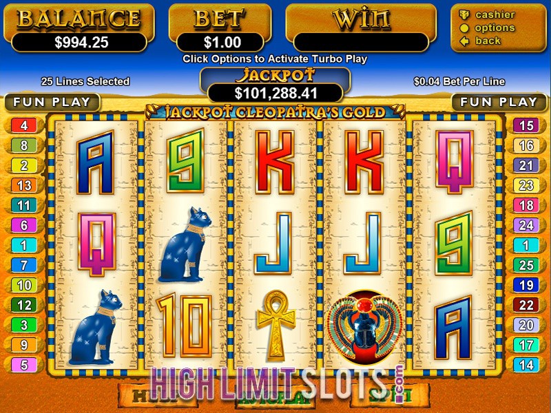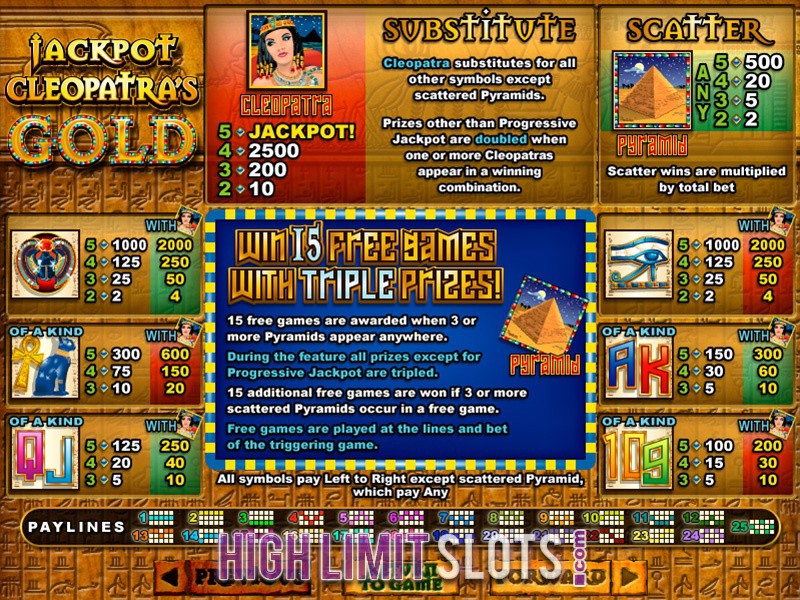 - Jackpot Cleopatra's Gold. With a progressive jackpot of over 150 thousand dollars, this video slot features 5 reels and 25 pay-lines as well as wild, scatter, free spins bonus round and a multiplier.