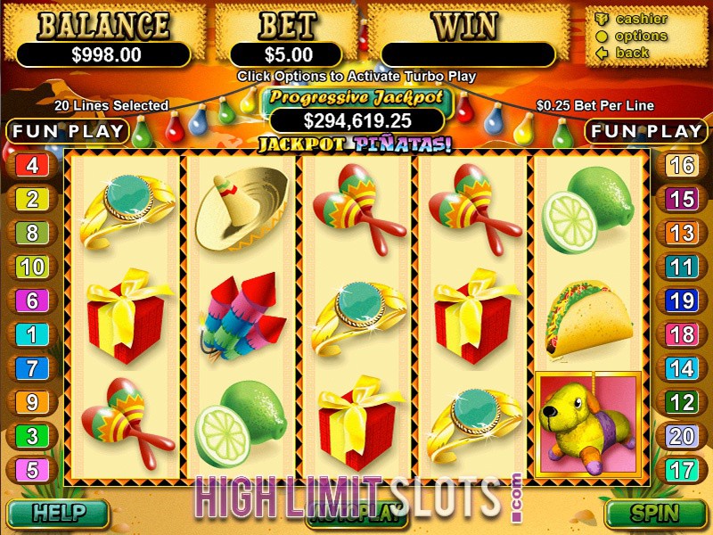 - Jackpot Piñatas. This video slot has 5 reels and 20 pay-lines and comes wild and scatter symbol, multiplier, free spins and has a current maximum jackpot win of over 1 million dollars.