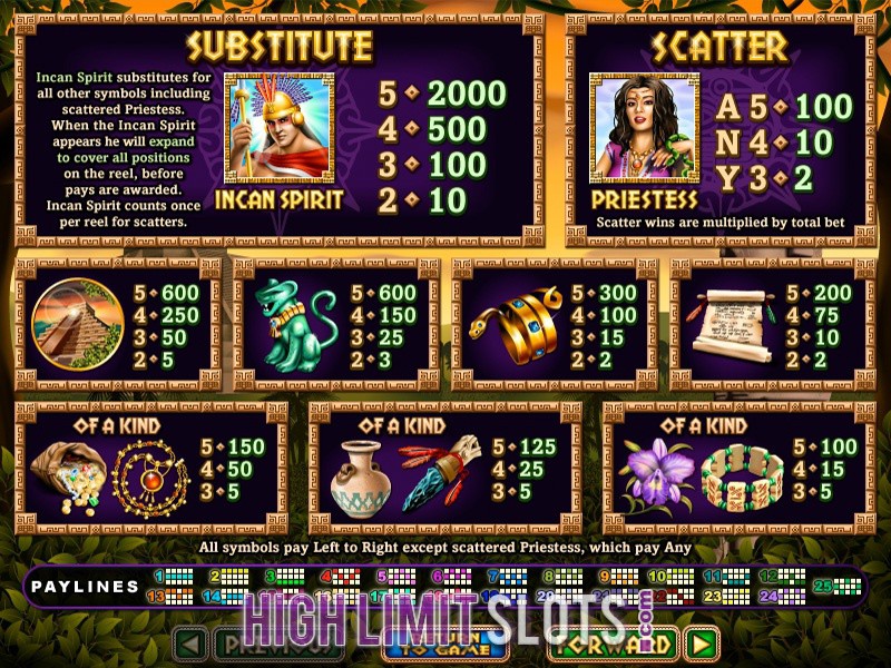 Online gamers will be blown away by the expertly designed game icons that depict different treasures and artefacts, and populate 5 reels and 25 paylines. Get up to 100x your total bet with Priestess Scatters or receive up to 25 free games with multipliers up to 10x when Incan Spirit Wild occurs on reels 1 and 5.