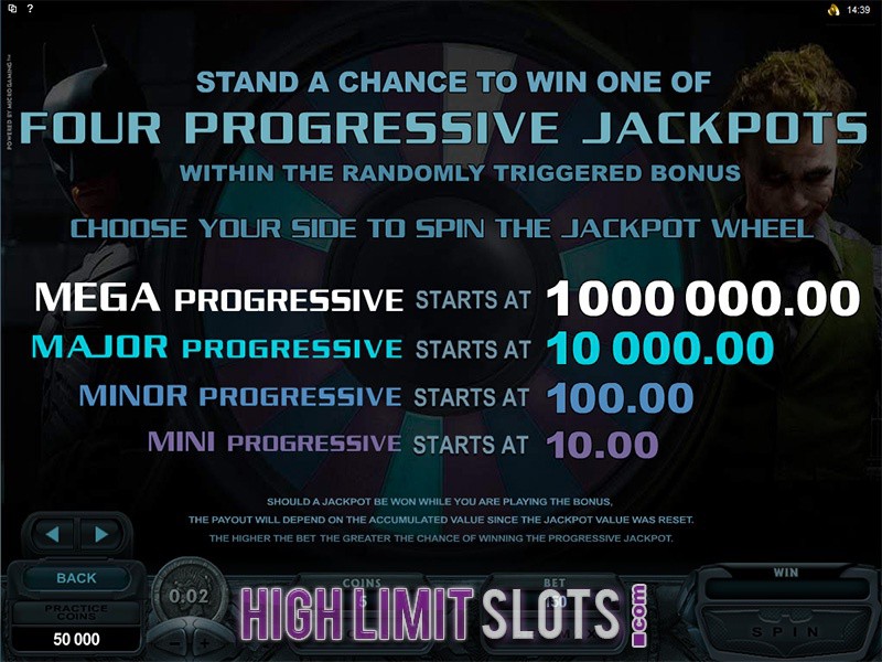 Batman and Joker can appear at any time during the game to award you a random prize, whereas the progressive jackpot game is activated at random after the conclusion of any spin. Should you be so lucky as to trigger this special feature you will win one of four progressive jackpots, with Mega progressive starting at whopping $1,000,000.